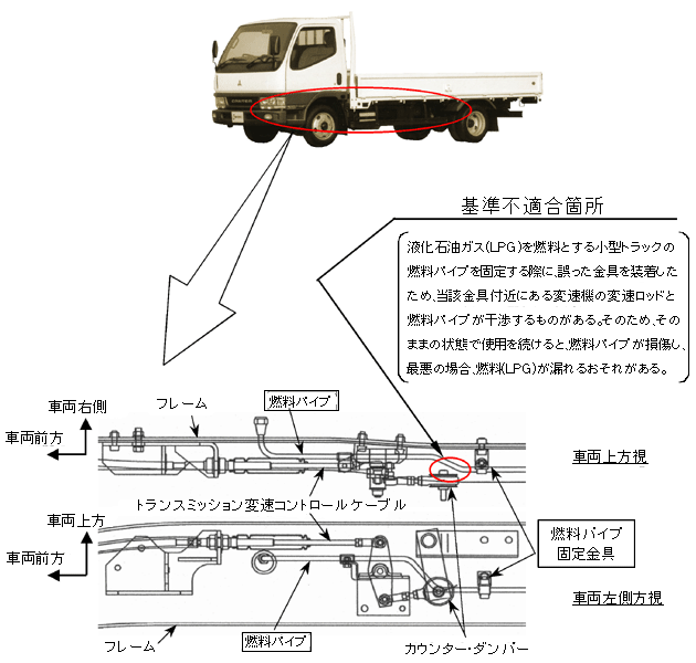 液化石油ガス(LPG)を燃料とする小型トラックの燃料パイプを固定する際に、誤った金具を装着したため、当該金具付近にある変速機の変速ロッドと燃料パイプが干渉するものがある。そのため、そのままの状態で使用を続けると、燃料パイプが損傷し、最悪の場合、燃料(LPG)が漏れるおそれがある。