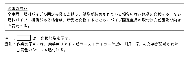 改善措置の内容 全車両、燃料パイプの固定金具を点検し、誤品が装着されている場合には正規品に交換する。なお燃料パイプに損傷がある場合は、新品と交換するとともにパイプ固定金具の取付け穴位置及び向きを変更する。