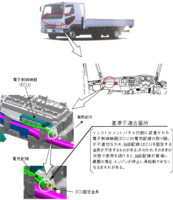 インストルメントパネル内部に装着された電子制御機器(ECU)の電気配線の取り廻しが不適切なため、当該配線とECUを固定する金具が干渉するものがある。そのため、そのままの状態で使用を続けると、当該配線が損傷し、最悪の場合、エンジンが停止し、再始動できなくなるおそれがある。