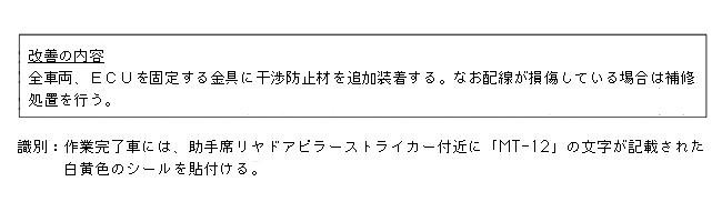 改善措置の内容 全車両、ECUを固定する金具に干渉防止材を追加装着する。なお配線が損傷している場合は補修処置を行う。