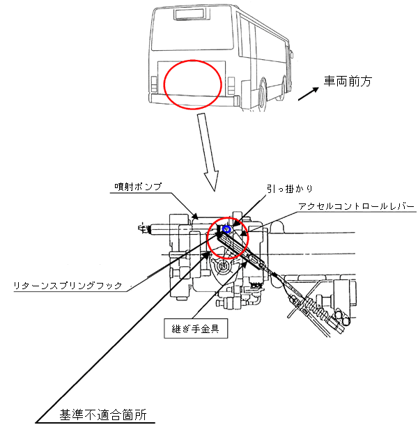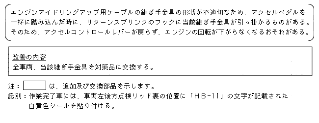 エンジンアイドリングアップ用ケーブルの継ぎ手金具の形状が不適切なため、アクセルペダルを一杯に踏み込んだ時に、リターンスプリングのフックに当該継ぎ手金具が引っ掛かるものがある。そのため、アクセルコントロールレバーが戻らず、エンジンの回転が下がらなくなるおそれがある。 | ||