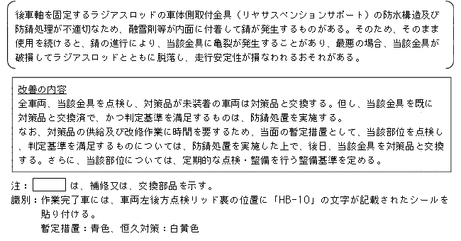 改善措置の内容 全車両、当該金具を点検し、対策品が未装着の車両は対策品と交換する。但し、当該金具を既に対策品と交換済で、かつ判定基準を満足するものは、防錆処置を実施する。