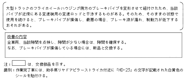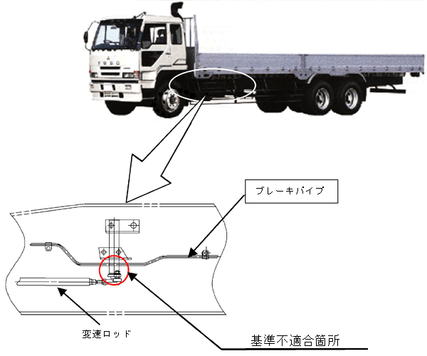 大型トラックのフライホイールハウジング側方のブレーキパイプを変形させて組付けたため、当該パイプが近傍にある変速機用の変速ロッドと干渉するものがある。そのため、そのままの状態で使用を続けると、ブレーキパイプが損傷し、最悪の場合、ブレーキ液が漏れ、制動力が低下するおそれがある。