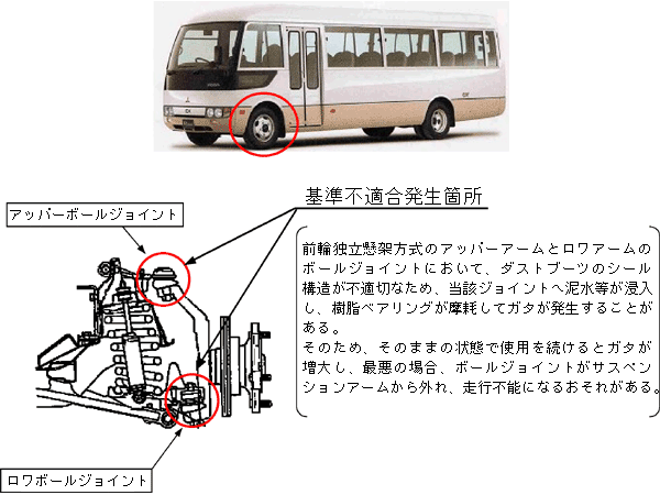 前輪独立懸架方式のアッパーアームとロワアームのボールジョイントにおいて、ダストブーツのシール構造が不適切なため、当該ジョイントへ泥水等が浸入し、樹脂ベアリングが摩耗してガタが発生することがある。 そのため、そのままの状態で使用を続けるとガタが増大し、最悪の場合、ボールジョイントがサスペンションアームから外れ、走行不能になるおそれがある。 |