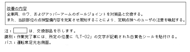 | 改善措置の内容 | 全車両、ロワ、およびアッパーアームのボールジョイントを対策品と交換する。 また、当該部位の点検整備内容を充実させ周知することにより、定期点検へのユーザの注意を喚起する。 |