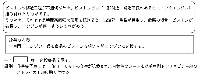 改善措置の内容 全車両、エンジン一式を良品のピストンを組込んだエンジンと交換する。