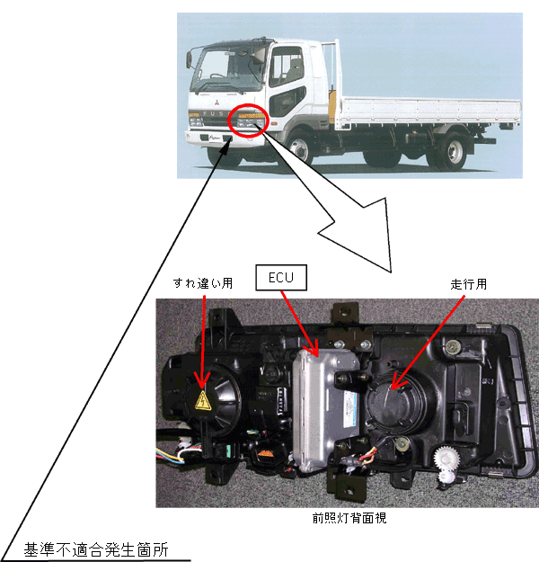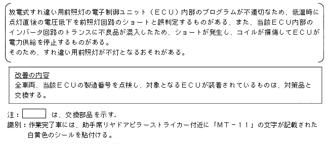 放電式すれ違い用前照灯の電子制御ユニット(ECU)内部のプログラムが不適切なため、低温時に点灯直後の電圧低下を前照灯回路のショートと誤判定するものがある、また、当該ECU内部のインバータ回路のトランスに不良品が混入したため、ショートが発生し、コイルが損傷してECUが電力供給を停止するものがある。 そのため、すれ違い用前照灯が不灯となるおそれがある。 |