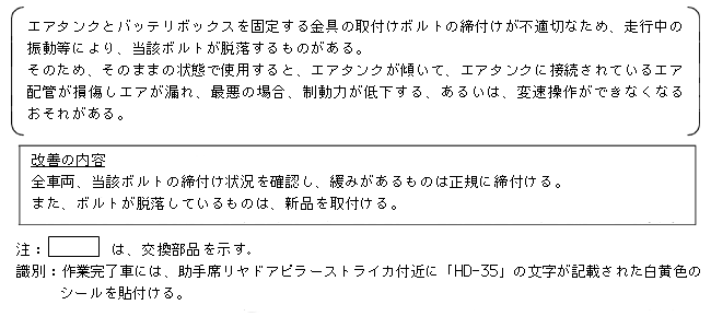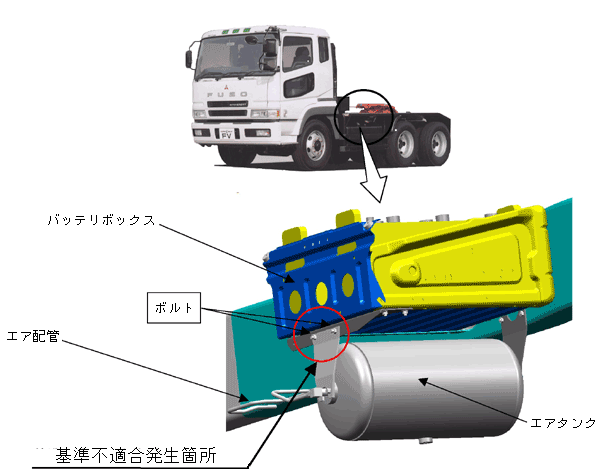 エアタンクとバッテリボックスを固定する金具の取付けボルトの締付けが不適切なため、走行中の振動等により、当該ボルトが脱落するものがある。 そのため、そのままの状態で使用すると、エアタンクが傾いて、エアタンクに接続されているエア配管が損傷しエアが漏れ、最悪の場合、制動力が低下する、あるいは、変速操作ができなくなるおそれがある。 |