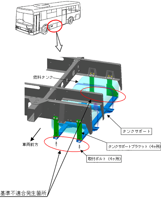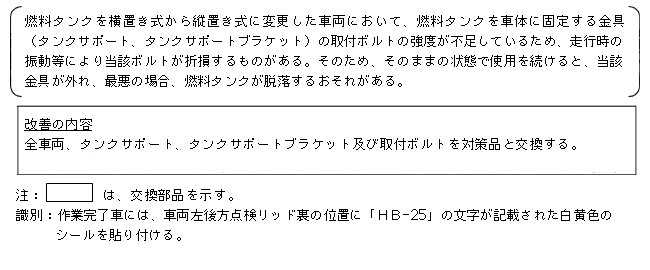 燃料タンクを横置き式から縦置き式に変更した車両において、燃料タンクを車体に固定する金具(タンクサポート、タンクサポートブラケット)の取付ボルトの強度が不足しているため、走行時の振動等により当該ボルトが折損するものがある。そのため、そのままの状態で使用を続けると、当該金具が外れ、最悪の場合、燃料タンクが脱落するおそれがある。