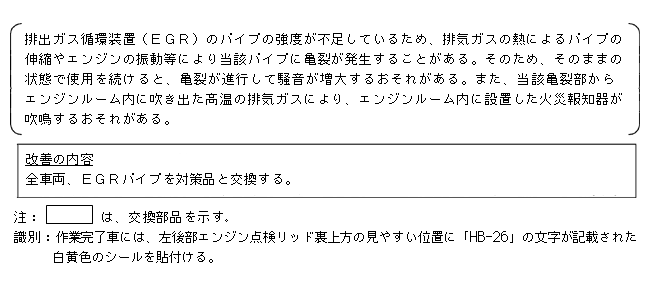 排出ガス循環装置(EGR)のパイプの強度が不足しているため、排気ガスの熱によるパイプの伸縮やエンジンの振動等により当該パイプに亀裂が発生することがある。そのため、そのままの状態で使用を続けると、亀裂が進行して騒音が増大するおそれがある。また、当該亀裂部からエンジンルーム内に吹き出た高温の排気ガスにより、エンジンルーム内に設置した火災報知器が吹鳴するおそれがある。