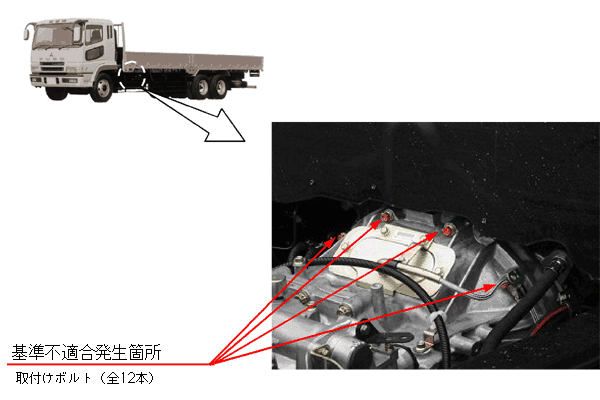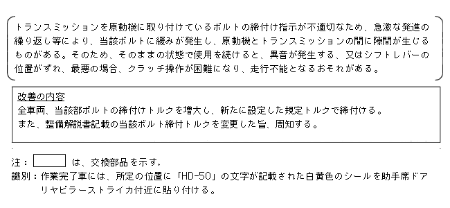 トランスミッションを原動機に取り付けているボルトの締付け指示が不適切なため、急激な発進の繰り返し等により、当該ボルトに緩みが発生し、原動機とトランスミッションの間に隙間が生じるものがある。そのため、そのままの状態で使用を続けると、異音が発生する、又はシフトレバーの位置がずれ、最悪の場合、クラッチ操作が困難になり、走行不能となるおそれがある。