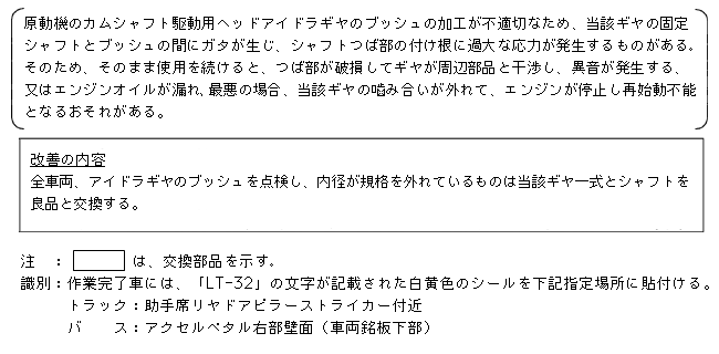 改善措置の内容 全車両、アイドラギヤのブッシュを点検し、内径が規格を外れているものは当該ギヤ一式とシャフトを良品と交換する。