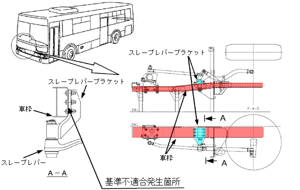 | ふそうエアロスターのかじ取り装置(スレーブレバー取付金具)について、平成17年9月14日に下記のリコールを国土交通省に届け出ました。ご愛用車の措置について、販売会社から早急にご連絡・ご相談をさせていただきますので、よろしくお願い申し上げます。ユーザの皆様には大変ご迷惑をおかけいたしますことを、心よりお詫び申し上げます。 |