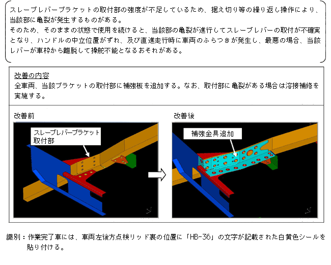 | 改善措置の内容 | 全車両、当該ブラケットの取付部に補強板を追加する。なお、取付部に亀裂がある場合は溶接補修を実施する。 | ||