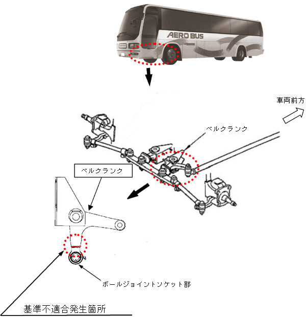 ベルクランクのボールジョイントソケット溶接部に溶接不良のものがあるため、据え切り等の繰り返し操作により、当該溶接部に亀裂が発生するものがある。 そのため、そのままの状態で使用を続けると亀裂が進行し、最悪の場合、当該部が破損してボールジョイントソケット部が抜け出し、操舵不能となるおそれがある。 |
