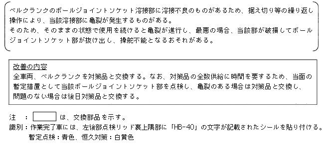 | 改善措置の内容 | 全車両、ベルクランクを対策品と交換する。なお、対策品の全数供給に時間を要するため、当面の暫定措置として当該ボールジョイントソケット部を点検し、亀裂のある場合は対策品と交換し、問題のない場合は後日対策品と交換する。 | ||