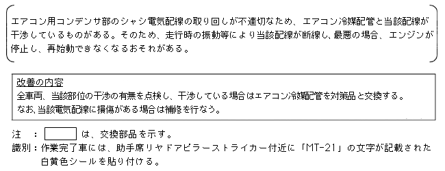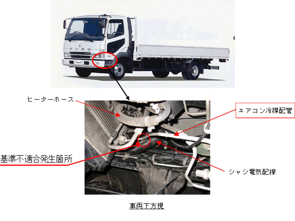 エアコン用コンデンサ部のシャシ電気配線の取り回しが不適切なため、エアコン冷媒配管と当該配線が干渉しているものがある。そのため、走行時の振動等により当該配線が断線し、最悪の場合、エンジンが停止し、再始動できなくなるおそれがある。 | ||