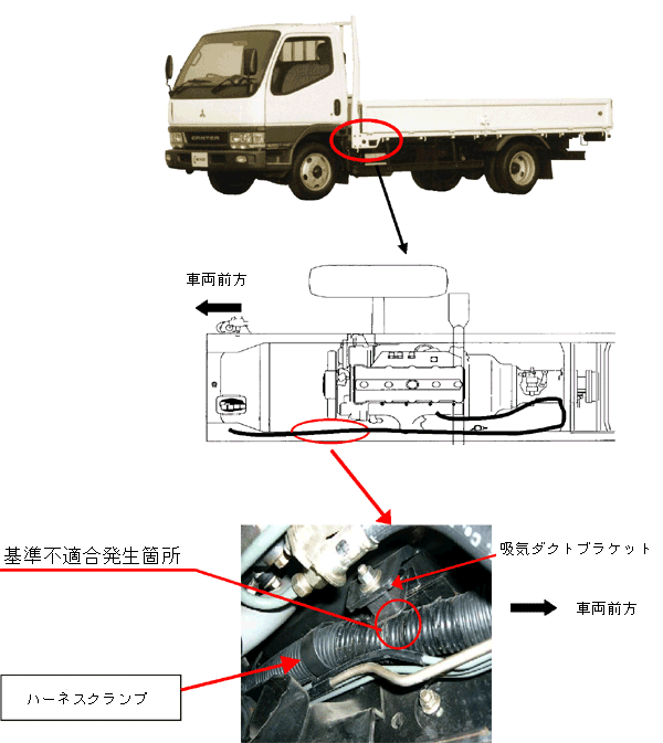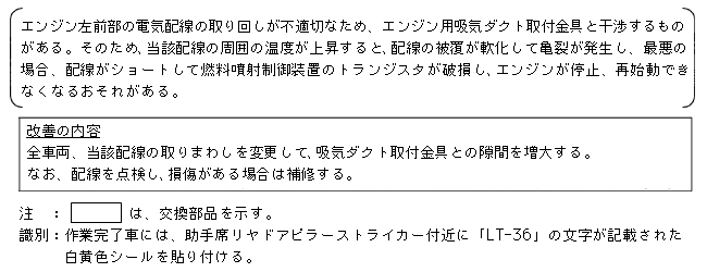 | 改善措置の内容 | 全車両、当該配線の取りまわしを変更して、吸気ダクト取付金具との隙間を増大する。なお、配線を点検し、損傷がある場合は補修する。 なお、当該電気配線に損傷がある場合は補修を行なう。 |
