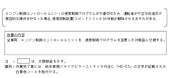 エンジン制御コントロールユニットの速度制御プログラムが不適切なため、運転者が不正な改造及び意図的な操作を行なった場合、速度抑制装置(スピードリミッタ)の作動が解除されるおそれがある。