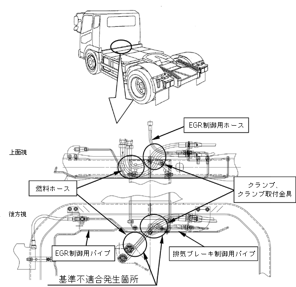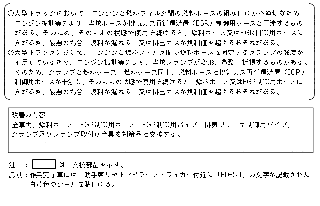 | 改善措置の内容 | 全車両、燃料ホース、EGR制御用ホース、EGR制御用パイプ、排気ブレーキ制御用パイプ、クランプ及びクランプ取付け金具を対策品と交換する。 | ||||||