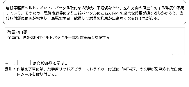 | 改善措置の内容 | 全車両、運転席座席ベルトバックル一式を対策品と交換する。 | ||
