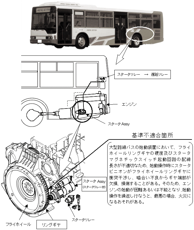 大型路線バスの始動装置において、フライホイールリングギヤの硬度及びスタータマグネチックスイッチ起動回路の配線長さが不適切なため、始動操作時にスタータピニオンがフライホイールリングギヤに衝突干渉し、噛合い不良からギヤ端部が欠損、損傷することがある。そのため、エンジンの始動が困難あるいは不能となり、始動操作を繰返し行なうと、最悪の場合、火災になるおそれがある。