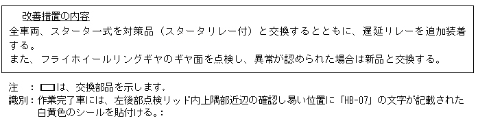 改善措置の内容 全車両、スタータ一式を対策品(スタータリレー付)と交換するとともに、遅延リレーを追加装着する。また、フライホイールリングギヤのギヤ面を点検し、異常が認められた場合は新品と交換する。