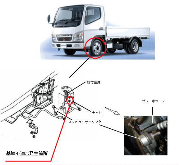スタビライザーリンク取り付け工程において、作業指示が不適切なため、取付ナットの締付けが不足している車両がある。そのため、そのままの状態で使用を続けると、当該ナットが脱落し、リンクが外れブレーキホースと干渉し、最悪の場合、ブレーキホースに穴があき、ブレーキ液が漏れ、制動力が低下するおそれがある。 | ||