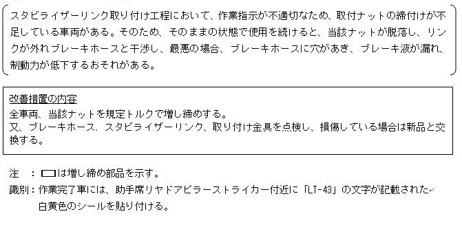 | 改善措置の内容 | 全車両、当該ナットを規定トルクで増し締めする。 又、ブレーキホース、スタビライザーリンク、取り付け金具を点検し、損傷している場合は新品と交換する。 |