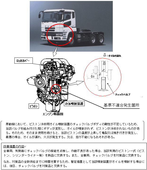 改善措置の内容 全車両、気筒毎にチェックバルブの機能を点検し、作動不良があった場合、当該気筒のピストン一式(ピストン、シリンダーライナー等)を新品に交換する。また、全車両、チェックバルブを対策品に交換する。