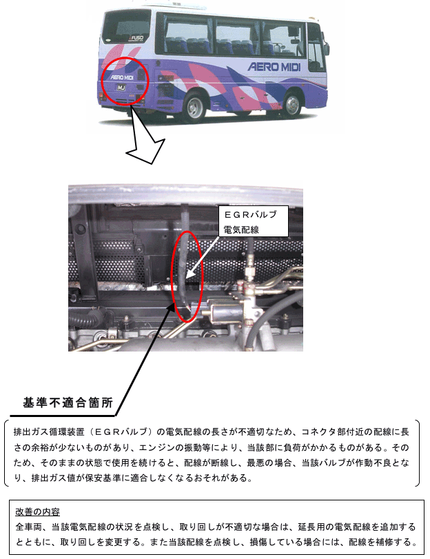 排出ガス循環装置(EGRバルブ)の電気配線の長さが不適切なため、コネクタ部付近の配線に長さの余裕が少ないものがあり、エンジンの振動等により、当該部に負荷がかかるものがある。そのため、そのままの状態で使用を続けると、配線が断線し、最悪の場合、当該バルブが作動不良となり、排出ガス値が保安基準に適合しなくなるおそれがある。 | ||
