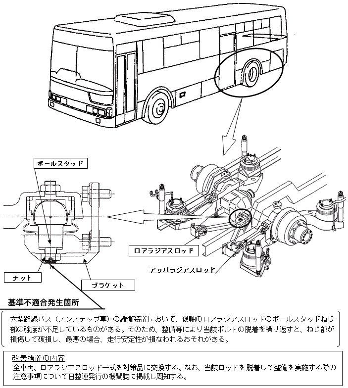 改善措置の内容 全車両、ロアラジアスロッド一式を対策品に交換する。なお、当該ロッドを脱着して整備を実施する際の注意事項について日整連発行の機関誌に掲載し周知する。