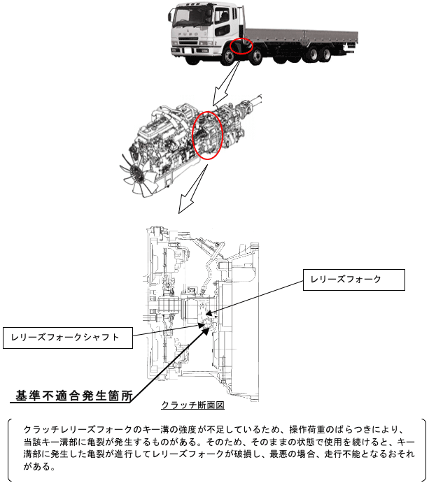 クラッチレリーズフォークのキー溝の強度が不足しているため、操作荷重のばらつきにより、当該キー溝部に亀裂が発生するものがある。そのため、そのままの状態で使用を続けると、キー溝部に発生した亀裂が進行してレリーズフォークが破損し、最悪の場合、走行不能となるおそれがある。 | ||