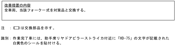 | 改善措置の内容 | 全車両、当該フォーク一式を対策品と交換する。 | ||