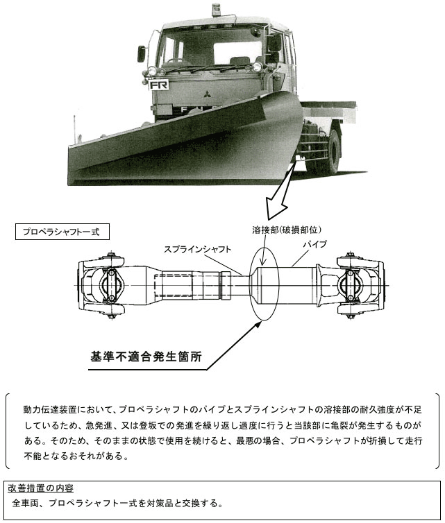 動力伝達装置において、プロペラシャフトのパイプとスプラインシャフトの溶接部の耐久強度が不足しているため、急発進、又は登坂での発進を繰り返し過度に行うと当該部に亀裂が発生するものがある。そのため、そのままの状態で使用を続けると、最悪の場合、プロペラシャフトが折損して走行不能となるおそれがある。