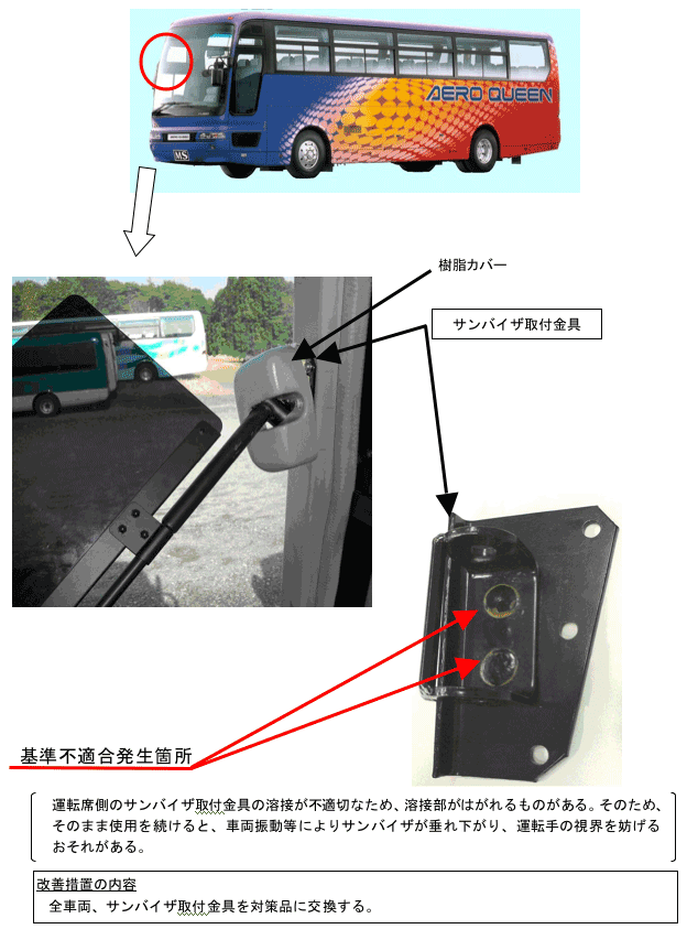 運転席側のサンバイザ取付金具の溶接が不適切なため、溶接部がはがれるものがある。そのため、そのまま使用を続けると、車両振動等によりサンバイザが垂れ下がり、運転手の視界を妨げるおそれがある。