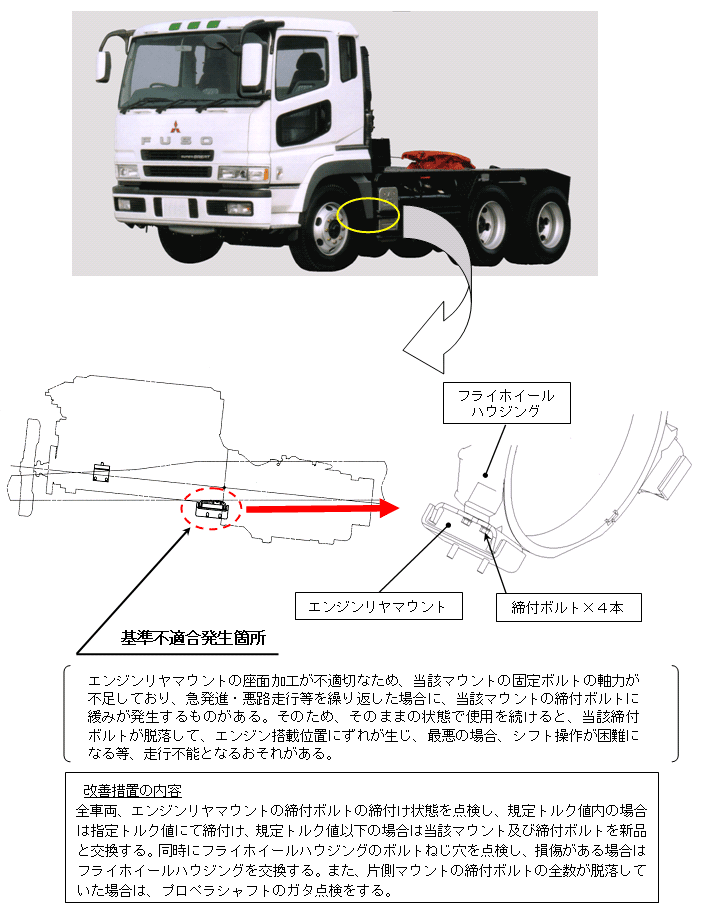 | 改善措置の内容 | 全車両、エンジンリヤマウントの締付ボルトの締付け状態を点検し、規定トルク値内の場合は指定トルク値にて締付け、規定トルク値以下の場合は当該マウント及び締付ボルトを新品と交換する。同時にフライホイールハウジングのボルトねじ穴を点検し、損傷がある場合はフライホイールハウジングを交換する。また、片側マウントの締付ボルトの全数が脱落していた場合は、プロペラシャフトのガタ点検をする。 | ||