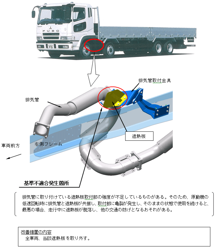 排気管に取り付けている遮熱板取付部の強度が不足しているものがある。そのため、原動機の低速回転時に排気管と遮熱板が共振し、取付部に亀裂が発生し、そのままの状態で使用を続けると、最悪の場合、走行中に遮熱板が脱落し、他の交通の妨げとなるおそれがある。 | ||