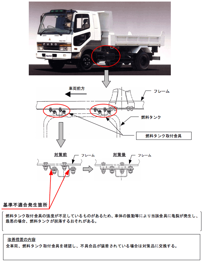 | 改善措置の内容 | 全車両、燃料タンク取付金具を確認し、不具合品が装着されている場合は対策品に交換する。 | ||