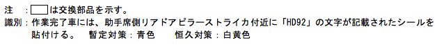 改善措置の内容 全車両、クロスメンバ及びリーフスプリング取付金具を対策品に交換する。なお、対策品の供給に時間を要することから、暫定措置として当該部を点検し、クロスメンバに亀裂が発生している場合には、溶接補修し、リーフスプリング取付金具に亀裂が発生している場合には、新品と交換し、後日対策品と交換する。
