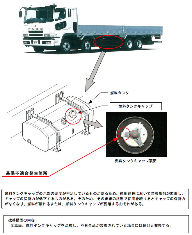 | ふそうスーパーグレート、ファイター、エアロクィーン、エアロバス、エアロミディの燃料装置(燃料タンクキャップ)について、 平成20年5月8日に下記のリコールを国土交通省に届け出ました。ご愛用車の措置について、販売会社から早急にご連絡・ご相談をさせていただきますので、よろしくお願い申し上げます。 ユーザの皆様には大変ご迷惑をおかけいたしますことを、心よりお詫び申し上げます。 |