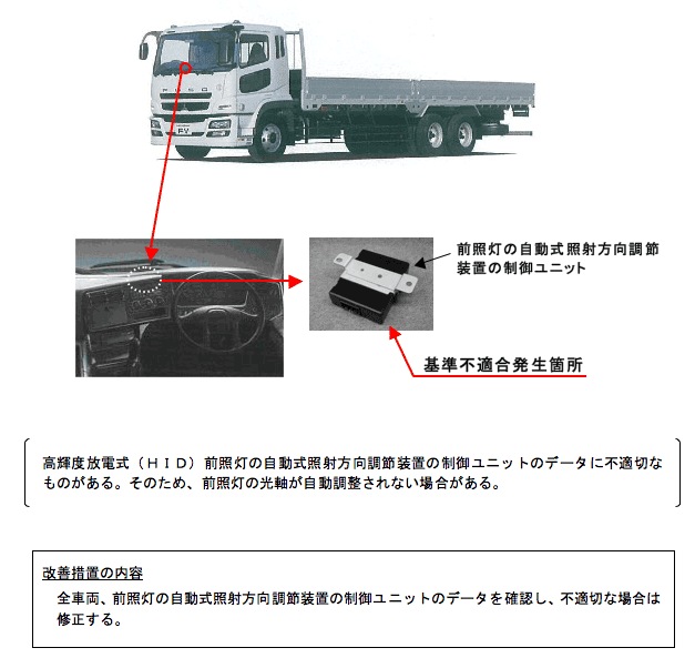 | 改善措置の内容 | 全車両、前照灯の自動式照射方向調節装置の制御ユニットのデータを確認し、不適切な場合は修正する。 | ||