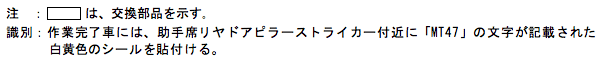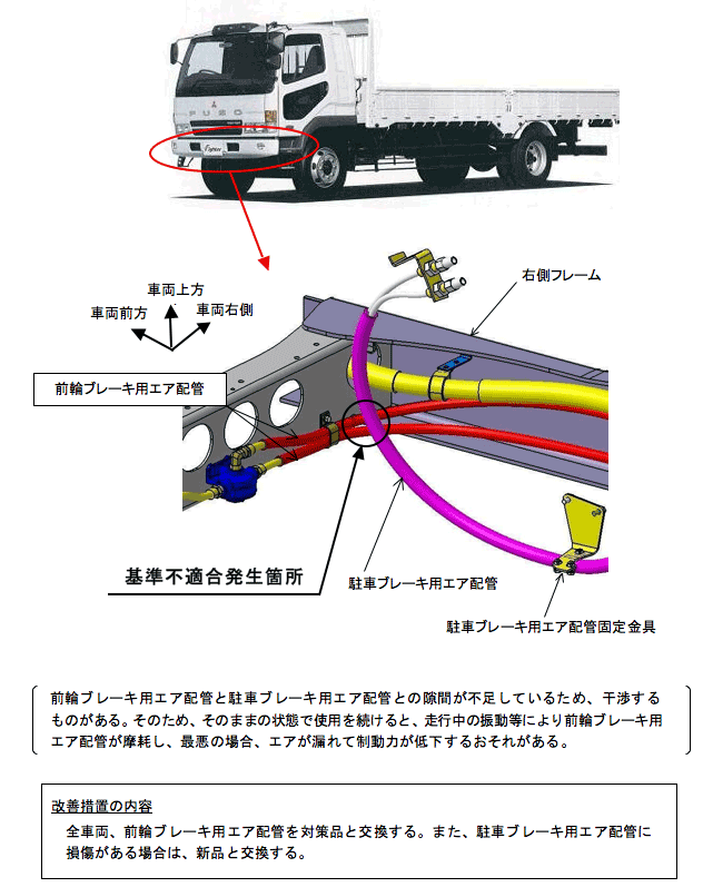 | 改善措置の内容 | 全車両、前輪ブレーキ用エア配管を対策品と交換する。また、駐車ブレーキ用エア配管に損傷がある場合は、新品と交換する。 | ||