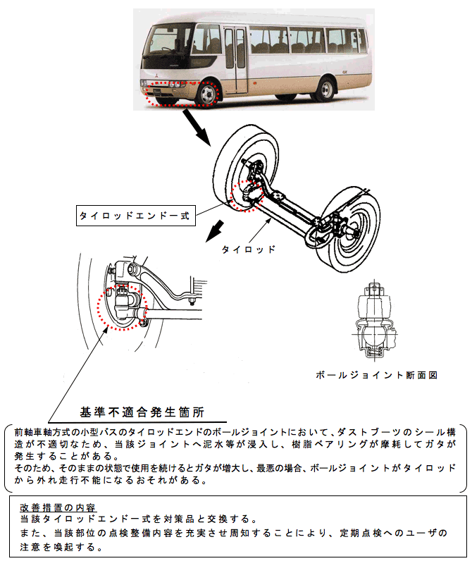前軸車軸方式の小型バスのタイロッドエンドのボールジョイントにおいて、ダストブーツのシール構造が不適切なため、当該ジョイントへ泥水等が浸入し、樹脂ベアリングが摩耗してガタが発生することがある。 そのため、そのままの状態で使用を続けるとガタが増大し、最悪の場合、ボールジョイントがタイロッドから外れ走行不能になるおそれがある。 |