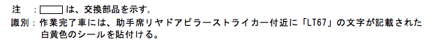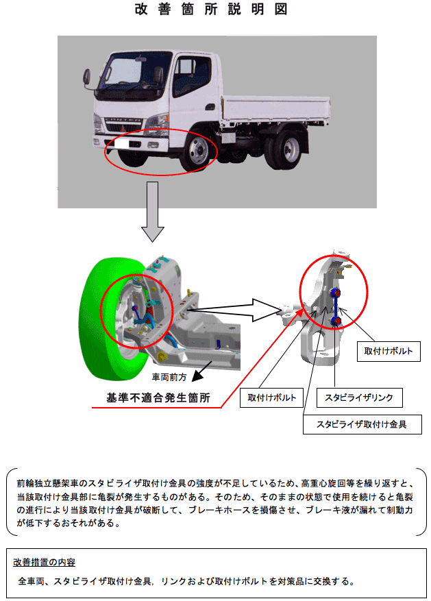 改善措置の内容 全車両、スタビライザ取付け金具,リンクおよび取付けボルトを対策品に交換する。