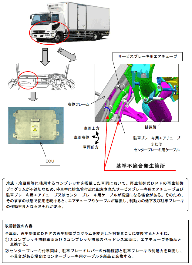 冷凍・冷蔵用等に使用するコンプレッサを搭載した車両において、再生制御式DPFの再生制御プログラムが不適切なため、停車中に排気管付近に配索されたサービスブレーキ用エアチューブ及び駐車ブレーキ用エアチューブ又はセンターブレーキ用ケーブルが高温になる場合がある。そのため、そのままの状態で使用を続けると、エアチューブやケーブルが溶損し、制動力の低下及び駐車ブレーキの作動不良となるおそれがある。 | ||||||