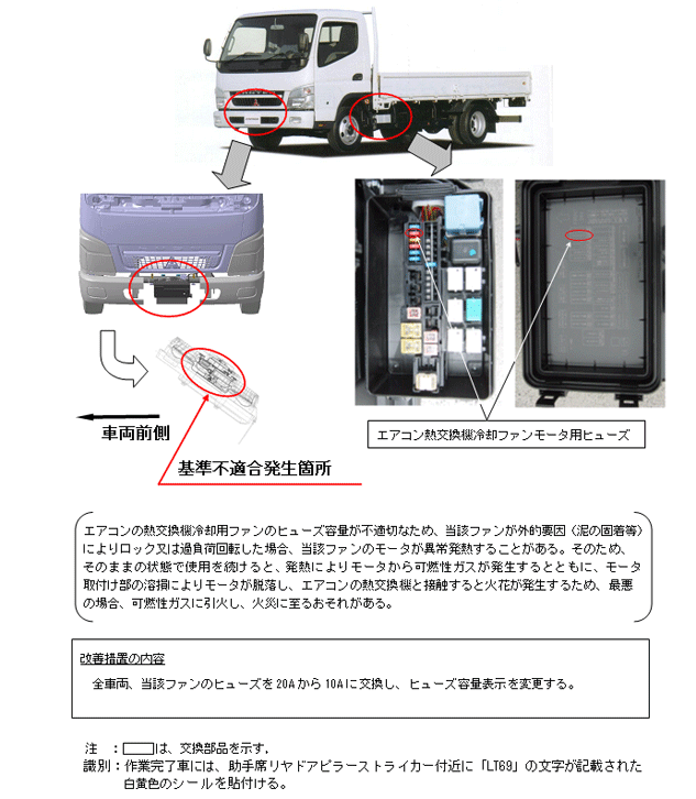 | 改善措置の内容 | 全車両、当該ファンのヒューズ容量を20Aから10Aに交換し、ヒューズ容量表示を変更する。 | ||