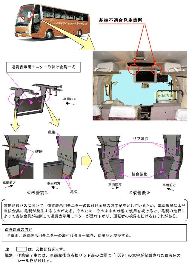 改善措置の内容 全車両、運賃表示用モニターの取付け金具一式を、対策品と交換する。