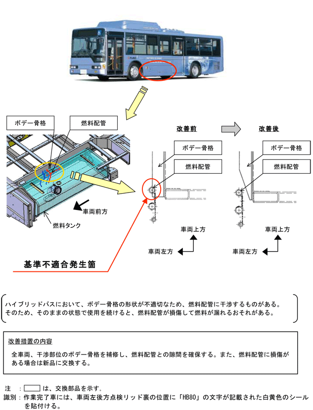 | 改善措置の内容 | 全車両、干渉部位のボデー骨格を補修し、燃料配管との隙間を確保する。また、燃料配管に損傷がある場合は新品に交換する。 | ||