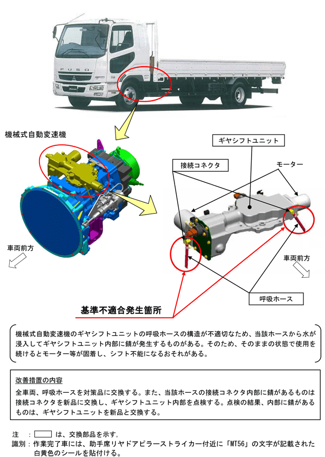 | 改善措置の内容 | 車両、呼吸ホースを対策品に交換する。また、当該ホースの接続コネクタ内部に錆があるものは接続コネクタを新品に交換し、ギヤシフトユニット内部を点検する。点検の結果、内部に錆があるものは、ギヤシフトユニットを新品と交換する。 | ||